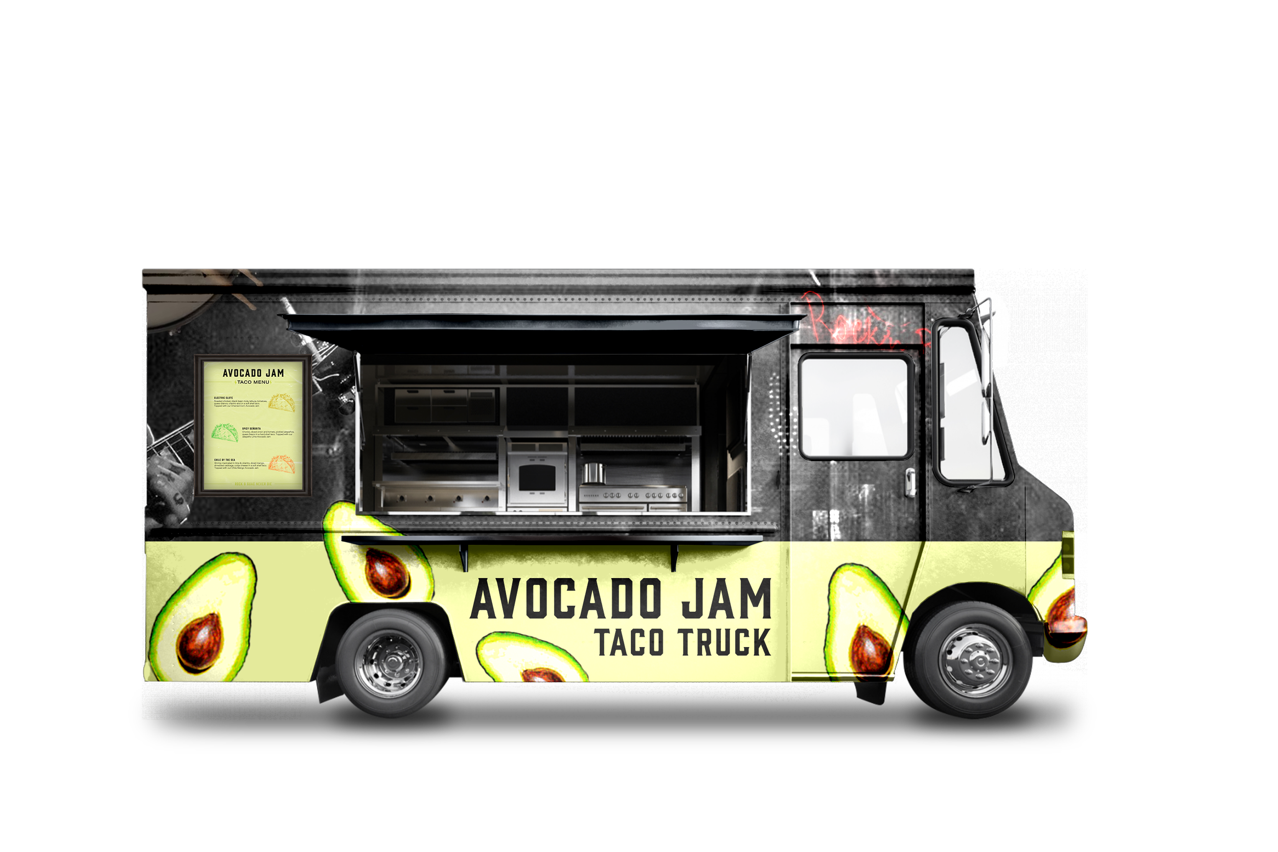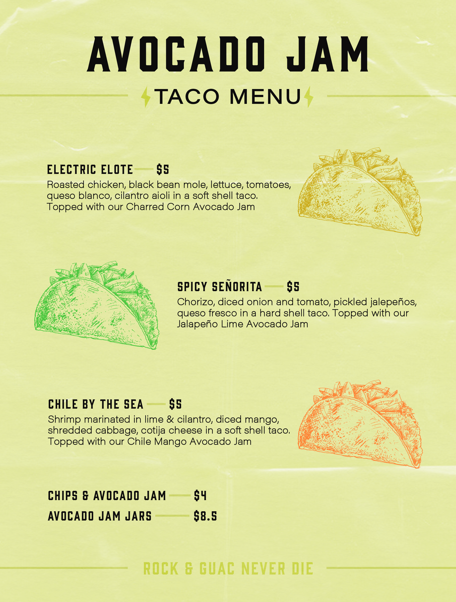 Besides rockin’ jam jars, I wanted to bring this idea to life by creating a pop-up moment sponsored by Avocado Jam. When a new brand hits the market, the shopper might not notice it on the shelf. Continuing with the rock theme, Avocado Jam will have a pop-up taco truck at Bonnaroo. Along with delicious tacos, concert attendees can purchase Avocado Jam all while head-banging to their favorite artists.